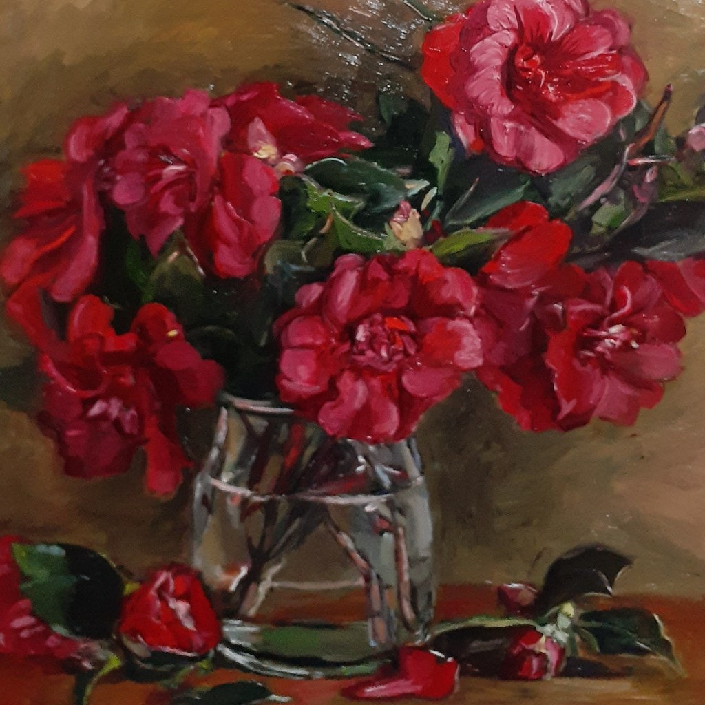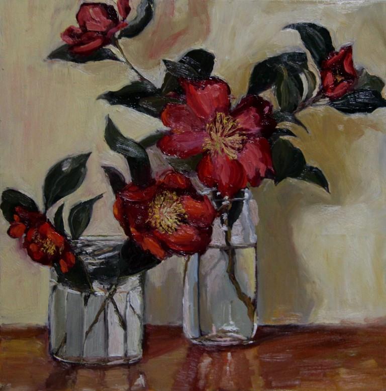 Red Camelias in Two Jars 40x40cm Oil on Canvas