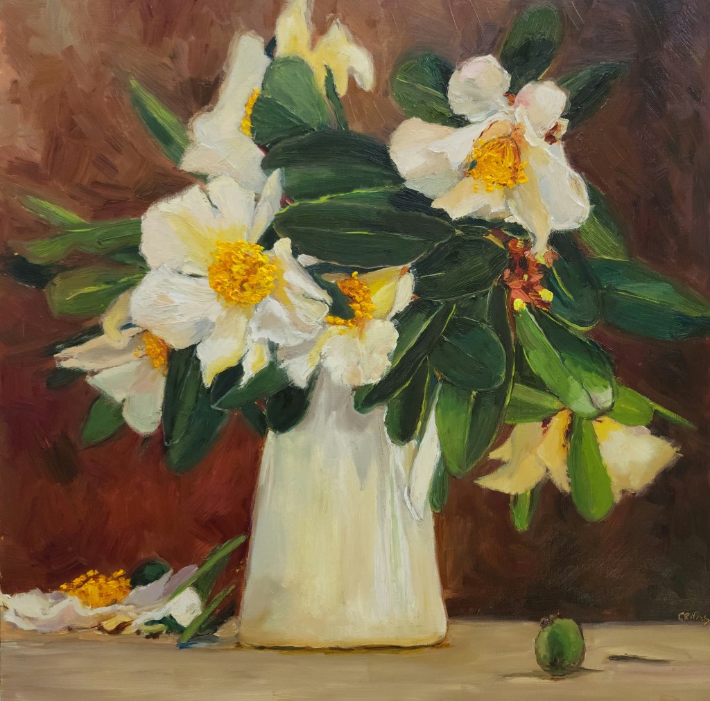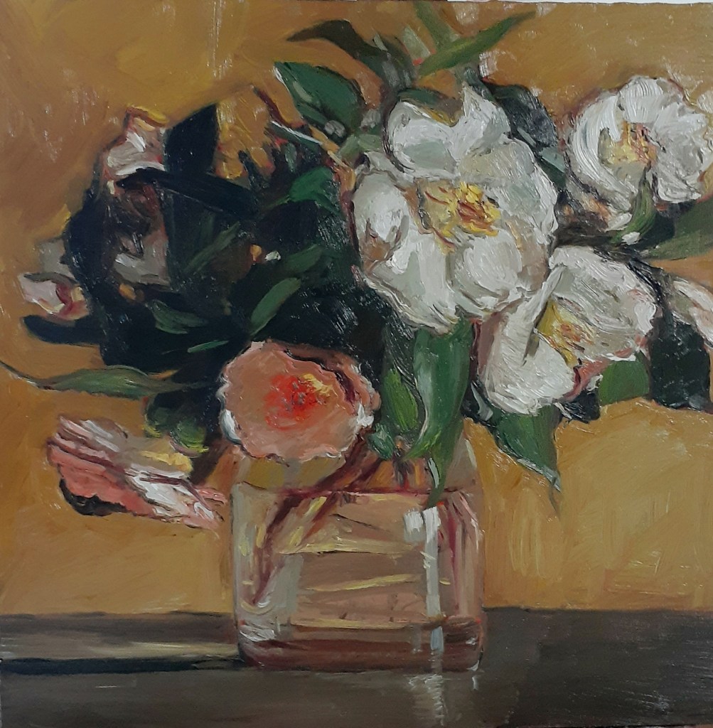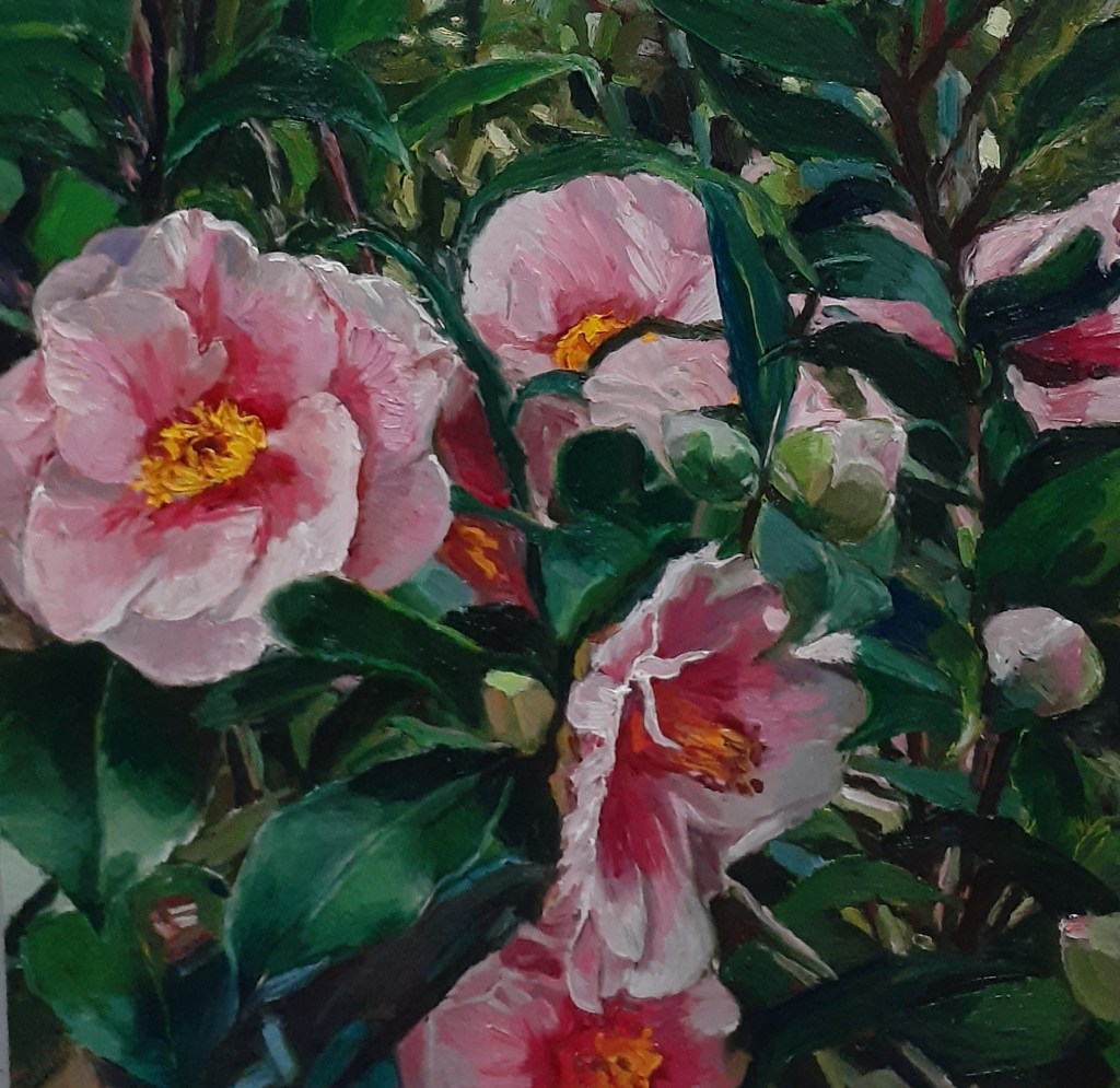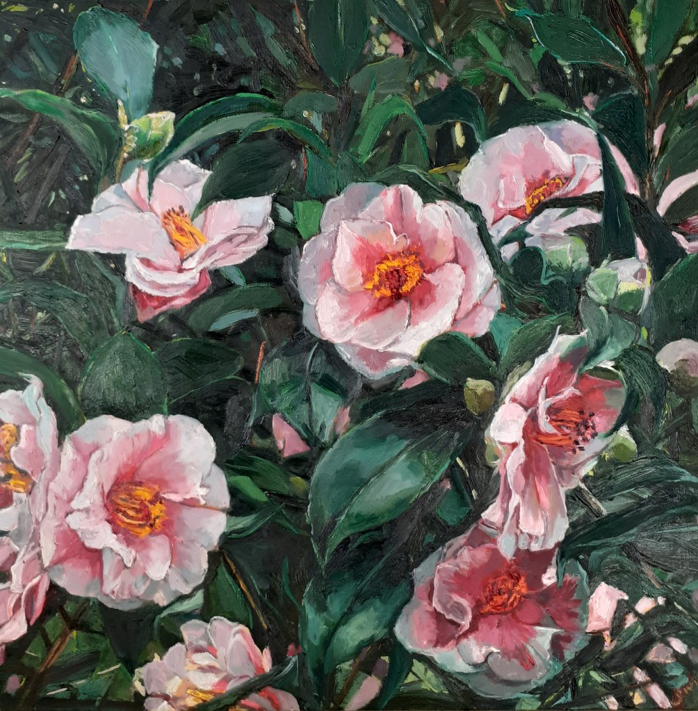Pink Camellias from the garden, 30x30cm Oil on Canvas SOLD