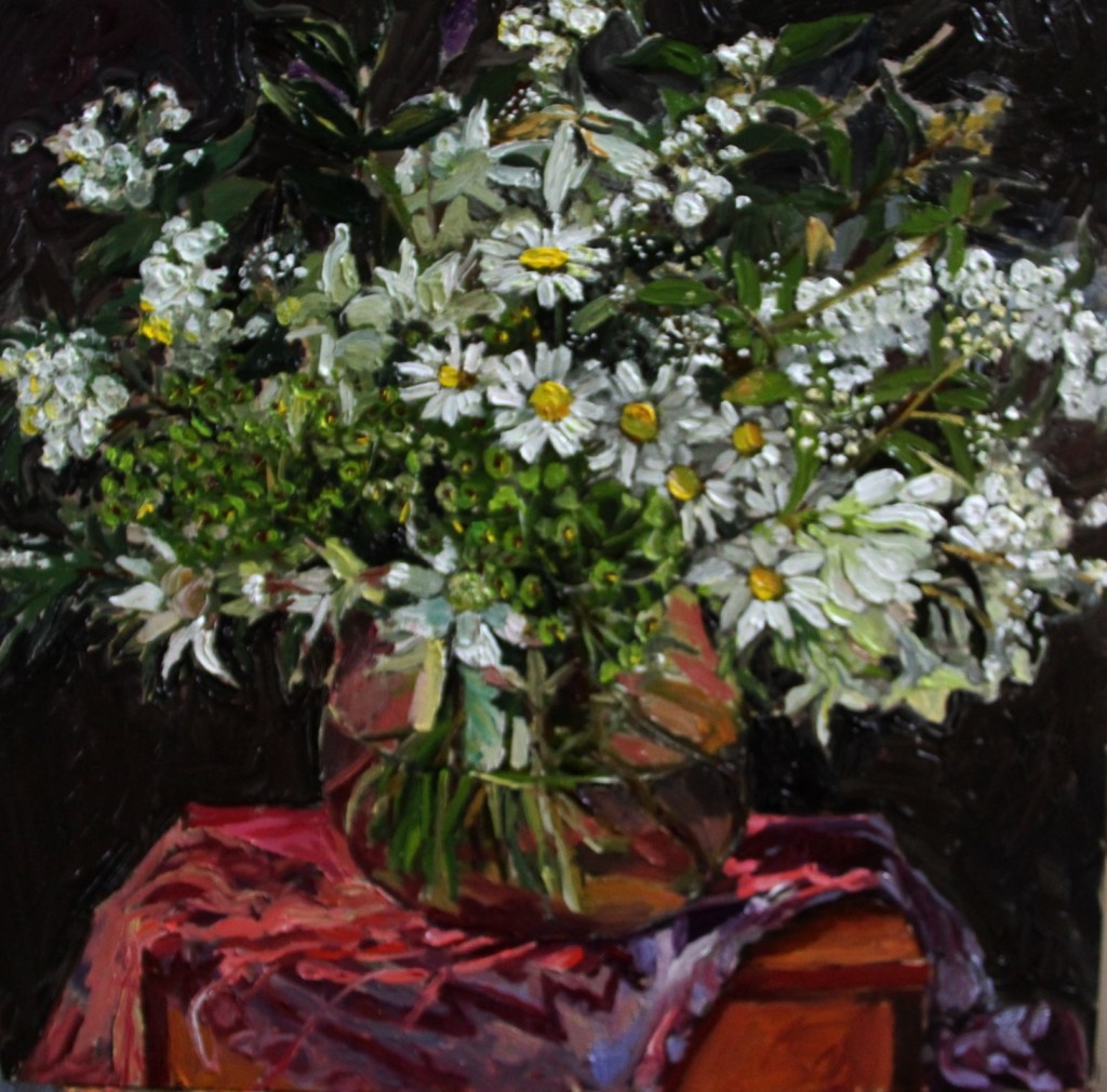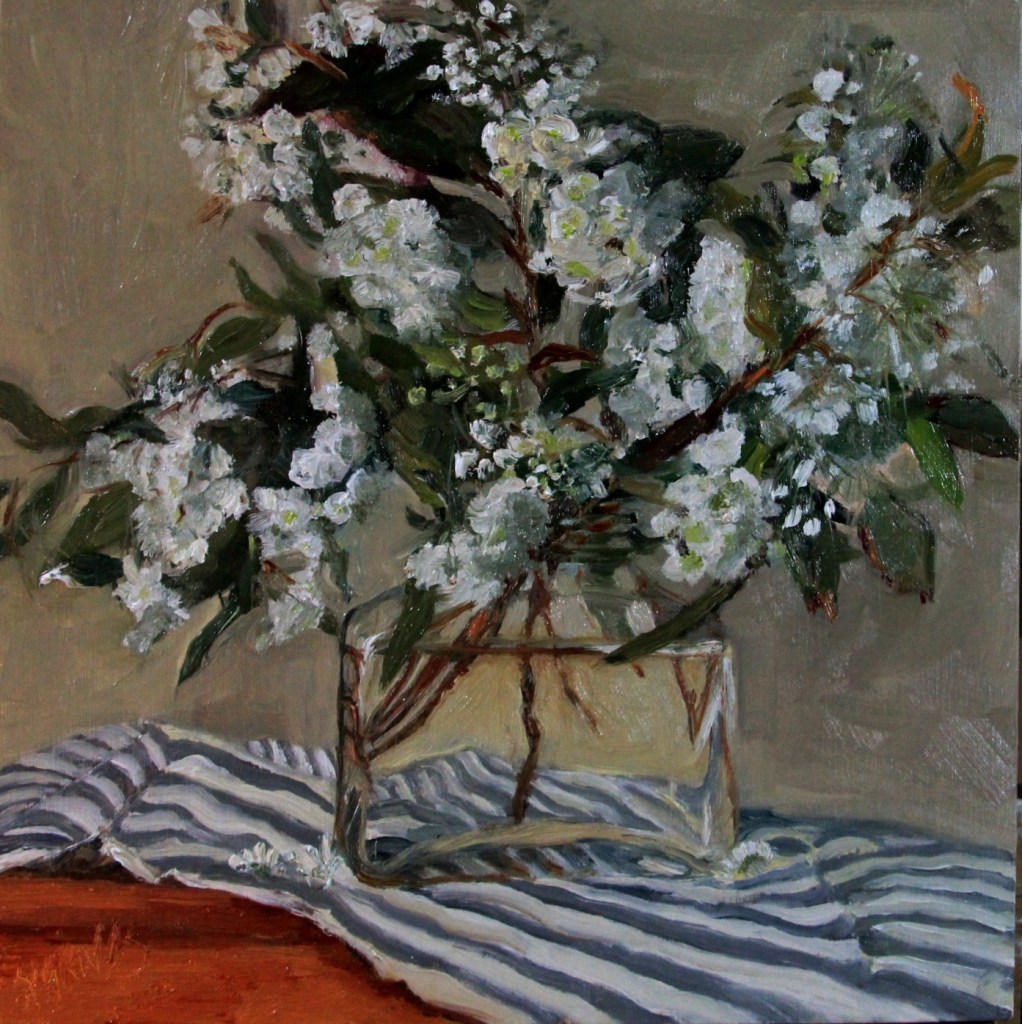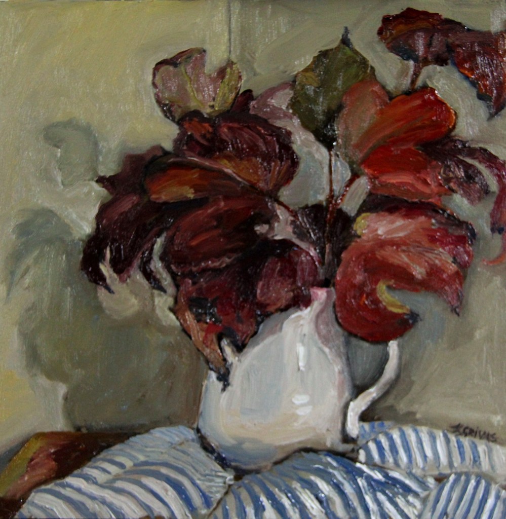 Striped Cloth & Flannel Flowers 50x50cm Oil on Birch Panel SOLD