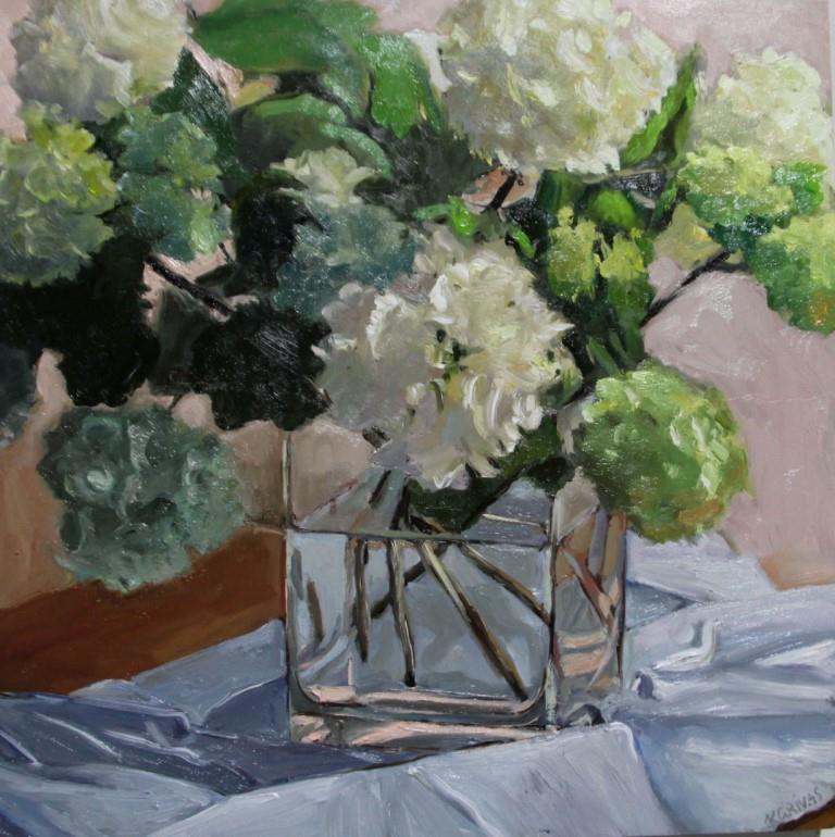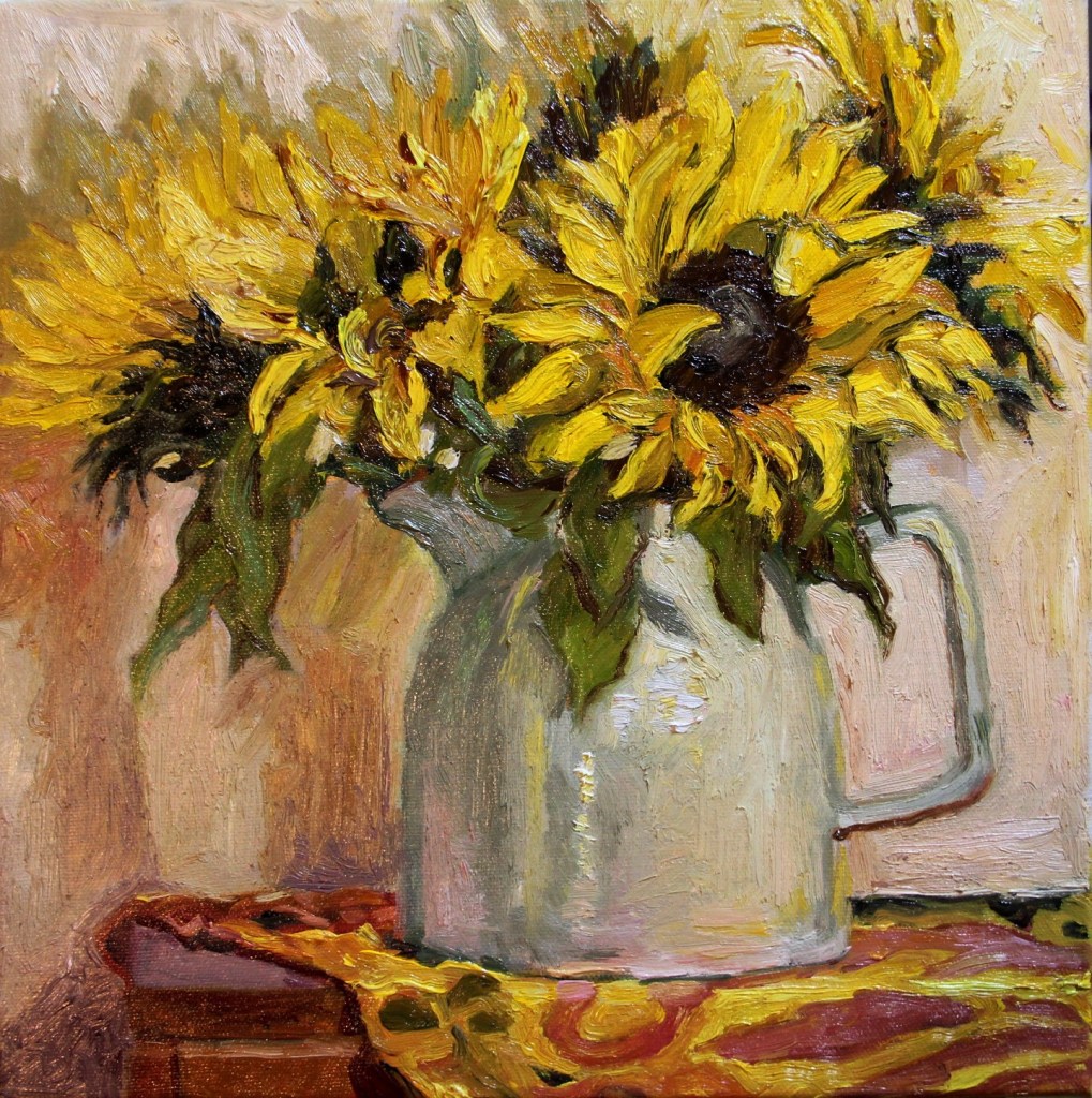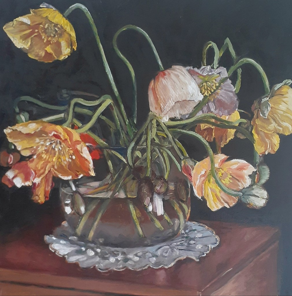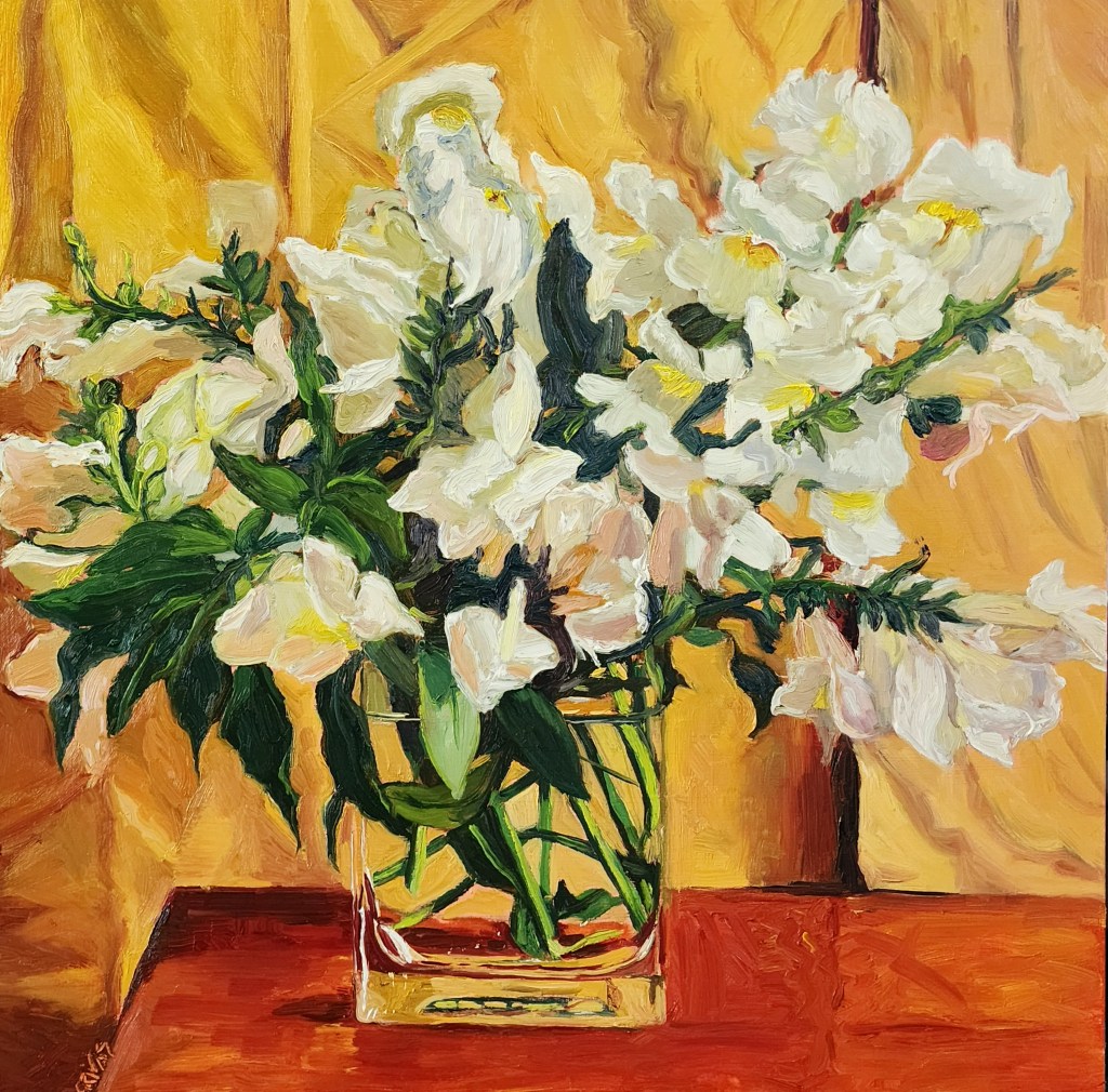 Striped Cloth & Flannel Flowers 50x50cm Oil on Birch Panel SOLD