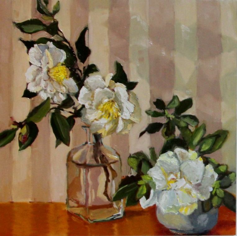 Camelia and Azalea on Stripes 40x40cm Oil on Birch Panel SOLD