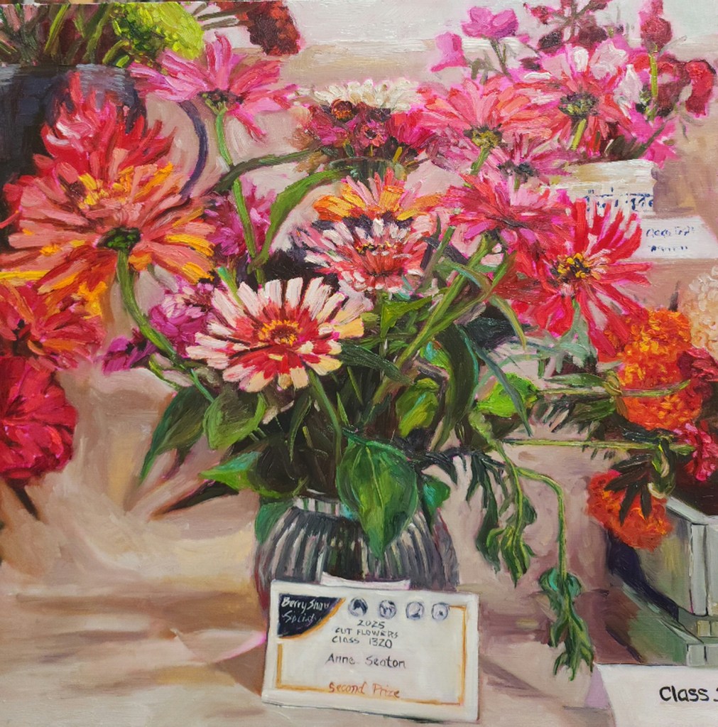 These cut flower exhibits, gathered from a country show, reflect the heart of rural life, where growing flowers is a connection to soil, seasons, and community. Each arrangement carries the care of the gardener, the pride of the grower, and the spirit of the local show where neighbours come together to share what they’ve nurtured. As a devoted and passionate painter of flowers, I felt an irresistible urge to capture the joy presented by the talented local children and avid gardeners